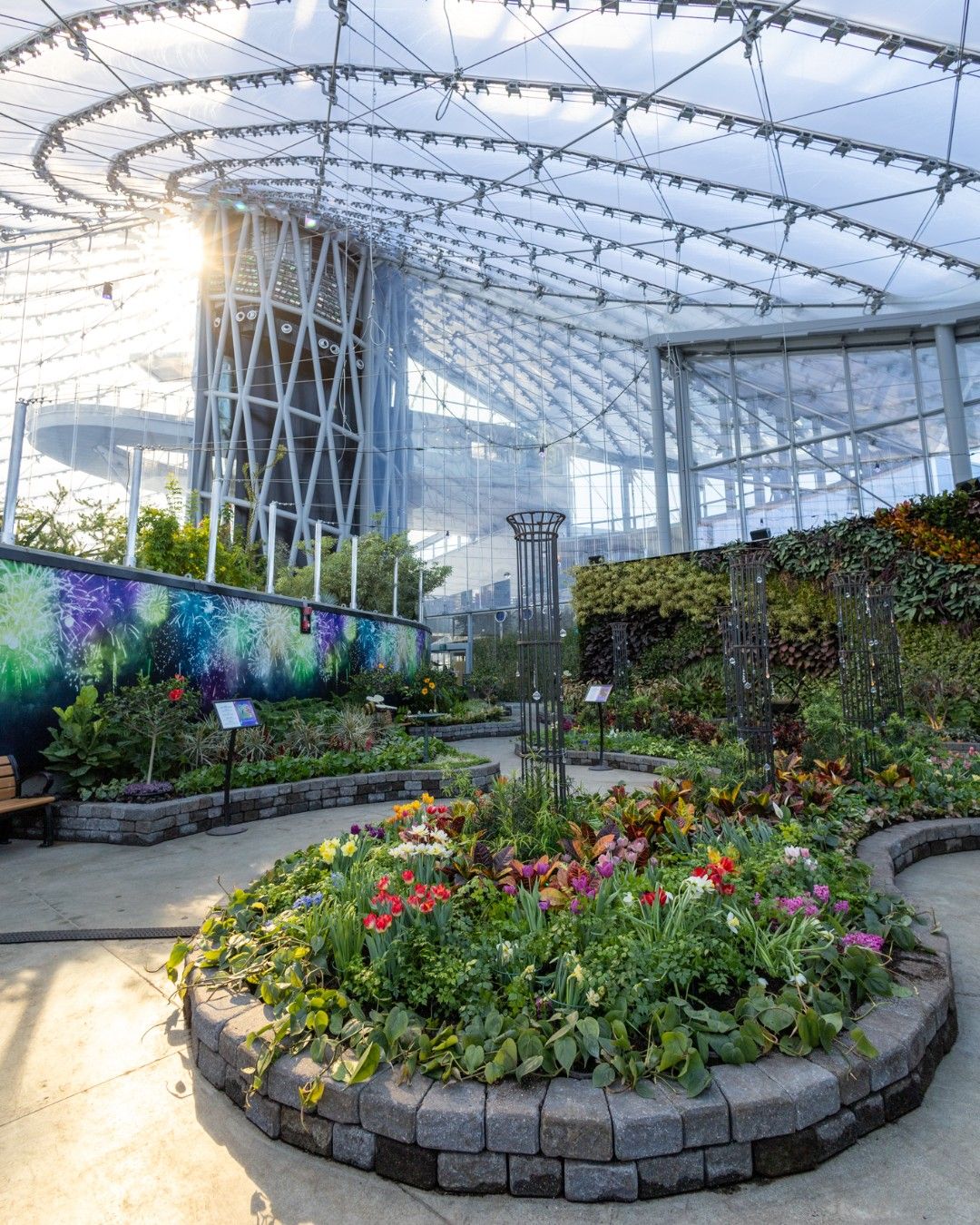 A large garden kaleidoscope, prisms, and glass installations that scatter light throughout the space